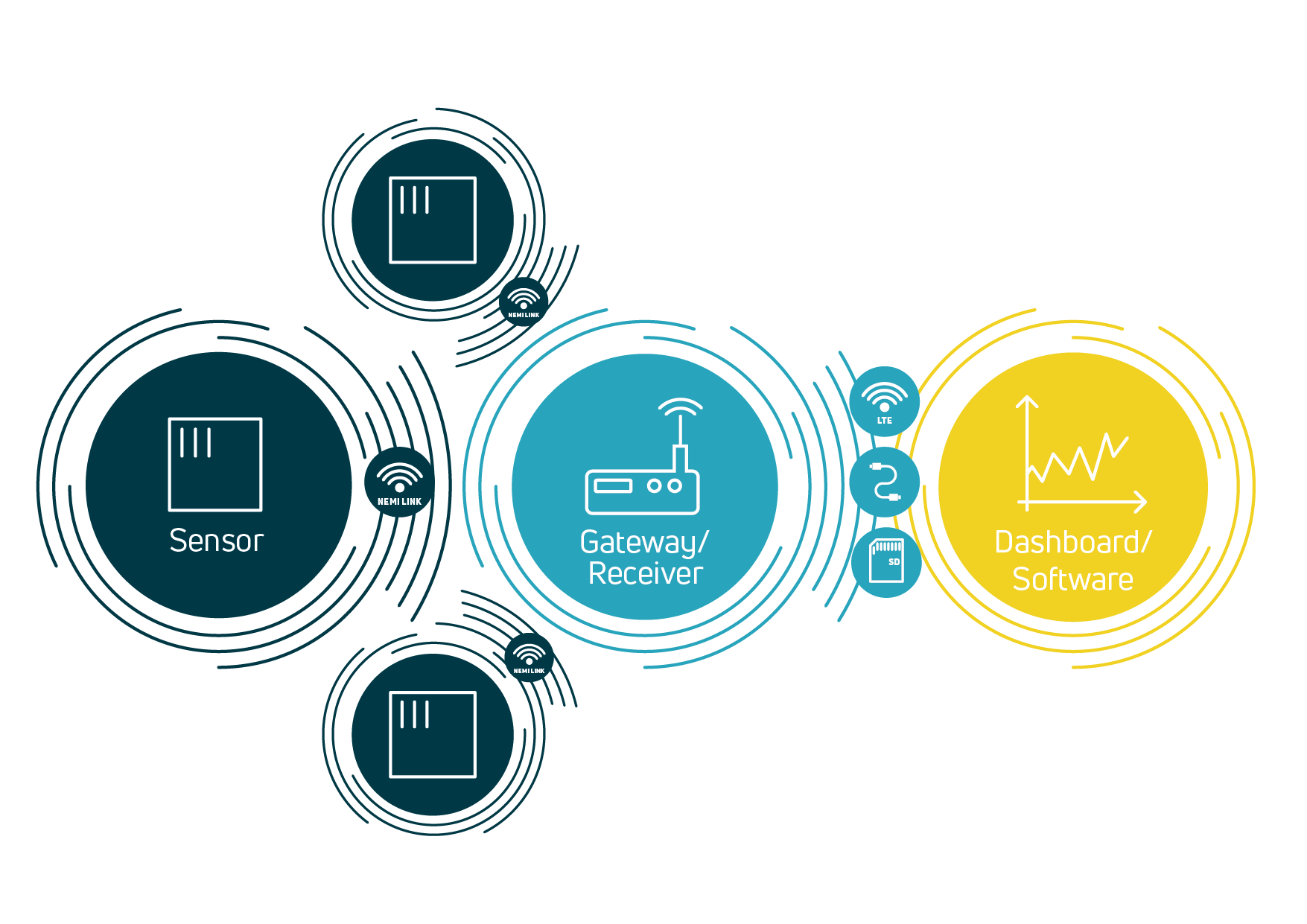 2.4 GHz frequency band or via nemi Link 868, our long range sensor network in the 868 MHz frequency band. The gateways / receivers provide the data via 4G cellular connection, cable or micro SD card.